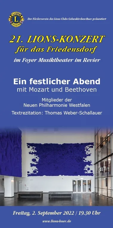 Zu einem festlichen Abend mit Mozart und Beethoven laden Musiker*innen der Neuen Philharmonie Westfalen sowie der Lions-Club Gelsenkirchen-Buer Anfang September ein - und das Ganze für einen guten Zweck. Der 21. Abend der Reihe „Konzert für das Friedensdorf“ findet am Freitag, 2. September 2022, um 19.30 Uhr nach langer Corona-bedingter Pause im Foyer des Musiktheaters im Revier Gelsenkirchen statt. Im Mittelpunkt des Konzerts steht die Musik Wolfgang Amadeus Mozarts sowie Ludwig van Beethovens.