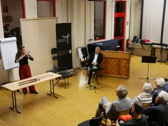 Einen kurzweiligen Abend mit einer Musikerin und gleich sechs Instrumenten verbrachten rund 60 Mitglieder des Vereins der Freunde und Förderer der Neuen Philharmonie Westfalen Mitte März im Recklinghäuser Depot. Kathrin Jöris, NPW-Solo-Flötistin, gab Einblicke in ihren Werdegang, die historische Entwicklung ihres Instruments und erzählte von musikalischen Kreuzfahrten rund um die Welt. Natürlich durfte auf die Musik nicht zu kurz kommen: Zusammen mit GMD Rasmus Baumann am Klavier präsentierte Jöris Werke quer durchs Flötenrepertoire – von Bach und Mozart über Chopin und Satie bis hin zum Csárdás … auf der Blockflöte.