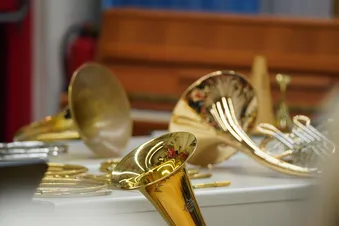Dreizehn Hörner auf den Tischen im kleinen Saal des Depots: Die NPW-Hornist*innen Sietske van Wieren und Bernd Eiteneuer brachten die Mitglieder des Fördervereins in einer neuen Ausgabe von „Meet & Greet“ im Recklinghäuser Depot im November zum Staunen.