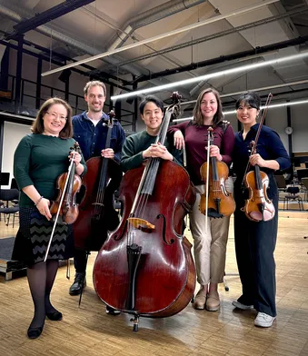 Es musizieren: Natasha Elvin (1. Violine), Chorong Hwang (2. Violine), Saskia Simion (Viola), François-Marie Lhuissier (Violoncello) und Yomoon Youn (Kontrabass).